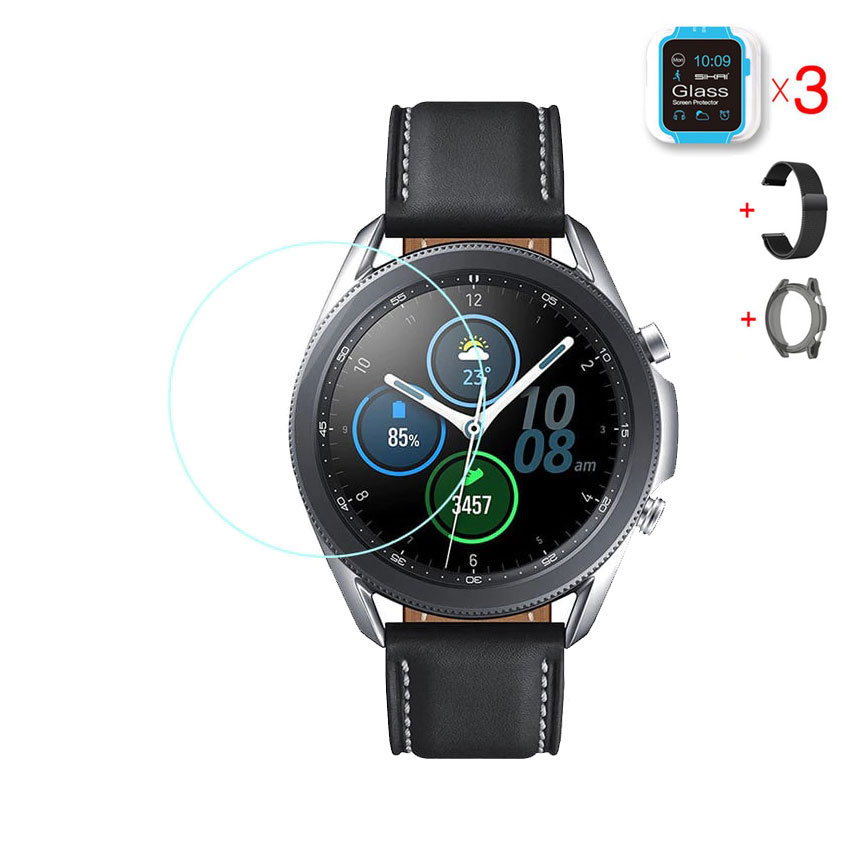 Samsung Galaxy Watch 3 45 mm Sikai 0,20 mm üvegfólia (3 db) + Sikai fekete színű milánói „rozsdamentes acél” szíj + Sikai fekete színű ütésálló átlátszó szilikon tok (2 db)